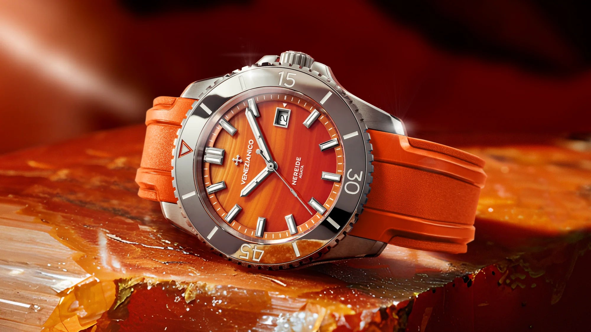 Nereide Agata proviene direttamente dalle profondità della terra. Questo particolare modello si distingue per il quadrante in agata, una pietra semipreziosa che si forma all'interno delle rocce vulcaniche. Quando la lava si raffredda, possono formarsi delle cavità, fornendo l'ambiente ideale per lo sviluppo dell'agata attraverso la deposizione di minerali.