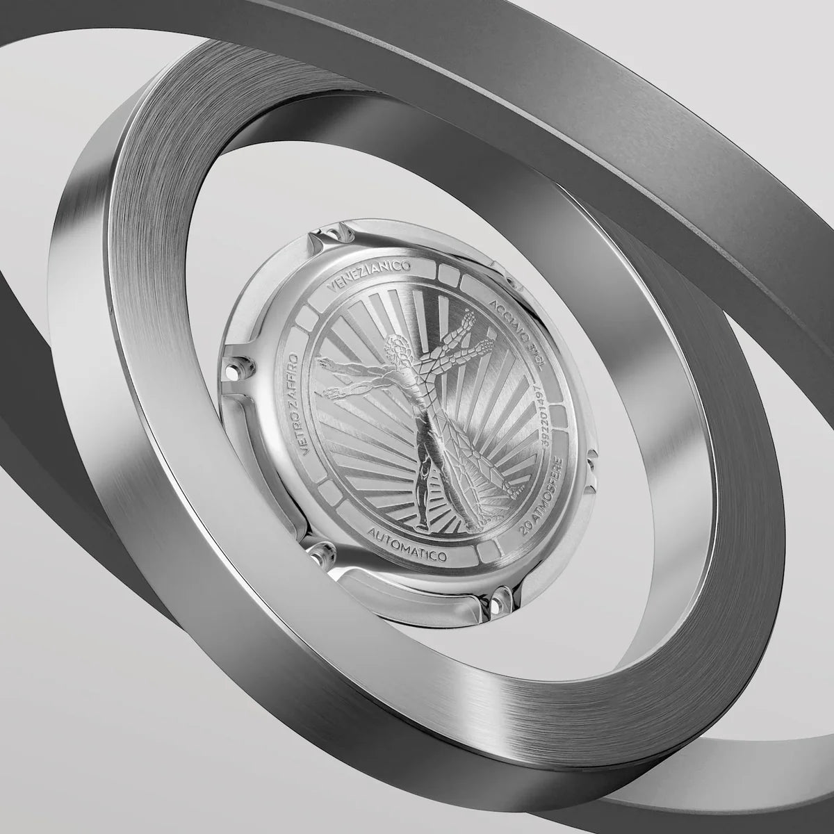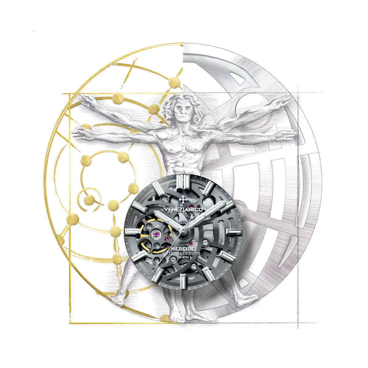 "Nereide Ultraleggero incarna un design ricercato, tecnico e innovativo. Il quadrante dell'orologio è armoniosamente bilanciato seguendo il rapporto matematico della proporzione aurea di Leonardo da Vinci. Questo conferisce un'equilibrata disposizione degli elementi, formando un'estetica affascinante e strutturata"