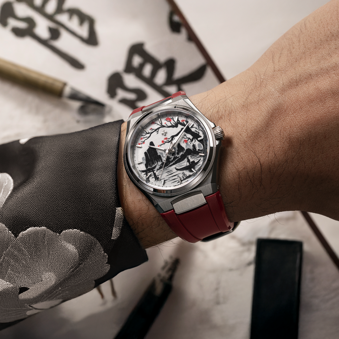 Arsenale Sumi-e nasce dallo stesso spirito esplorativo che per secoli ha guidato Venezia lungo la Via della Seta. Come allora le spezie, le sete e le idee viaggiavano da Oriente a Occidente, oggi questa creazione intreccia due mondi uniti dalla cura artigianale e dalla ricerca dell’armonia. Il quadrante, realizzato su autentica carta Washi, è ottenuto attraverso un processo tampografico in cinque fasi che riproduce la delicatezza dell’inchiostro e le sue sfumature sulla carta, dando vita a un paesaggio poetico racchiuso nel tempo.