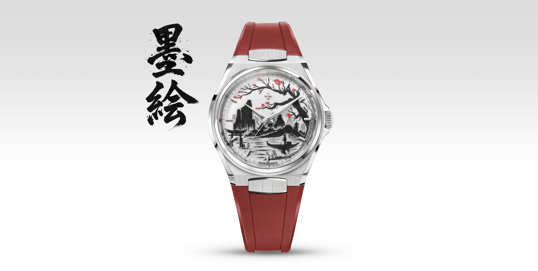 Arsenale Sumi-e racchiude lo spirito esplorativo che un tempo guidava Venezia lungo la Via della Seta, dove Oriente e Occidente si incontravano in un dialogo di arte e bellezza. Il quadrante, in autentica carta Washi, riproduce la fluidità dell’inchiostro attraverso un accurato processo di stampa in cinque fasi, trasformando il tempo in un paesaggio poetico.