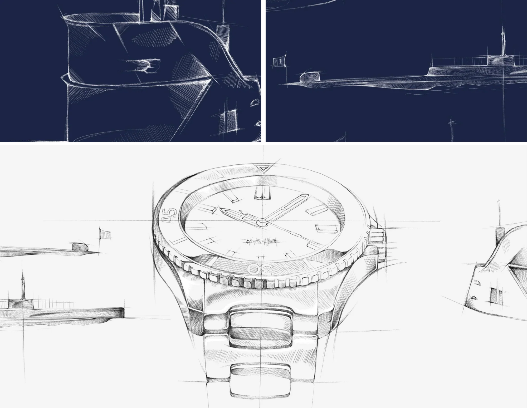 Il sommergibile Nereide, da cui trae ispirazione tutta la collezione, è raffigurato in navigazione sommersa nell’incisione al centro del fondello, per ricordare come questo orologio non rinunci alle prestazioni subacquee, conservando la capacità di immergersi fino a 200m di profondità e la lunetta girevole che permette di monitorare i tempi di immersione.