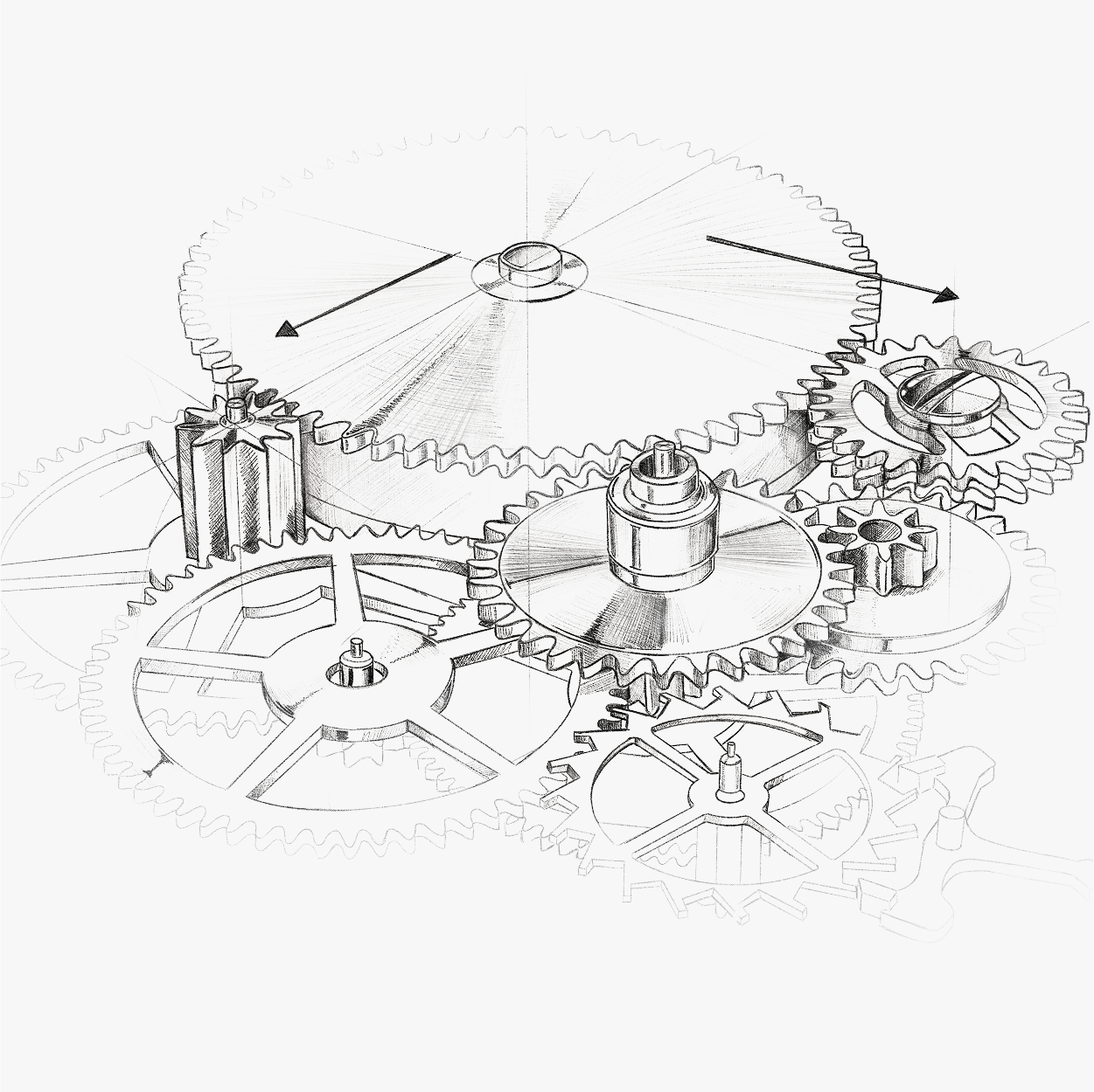 In questo sistema, la trasmissione del moto è divisa in due rami distinti: uno dedicato ai secondi, l’altro a ore e minuti. Questa separazione meccanica riduce le interferenze tra i treni del tempo, evitando che le sollecitazioni dovute al movimento continuo della lancetta dei secondi influenzino la regolarità del sistema principale. Il risultato è una maggiore stabilità di marcia e una precisione più affidabile nel tempo. Un approccio raffinato alla costruzione del movimento, che privilegia la precisione a lungo termine.