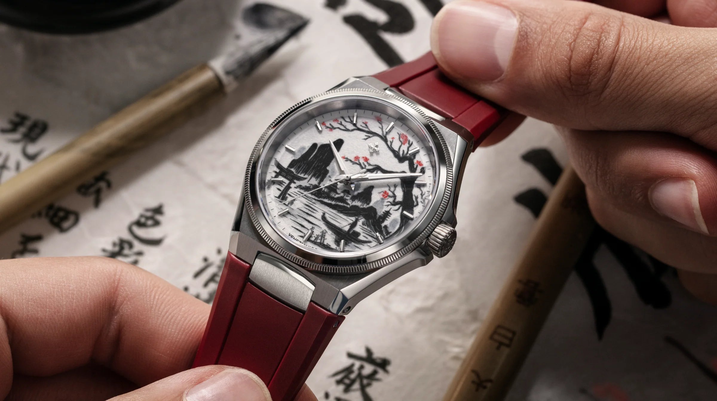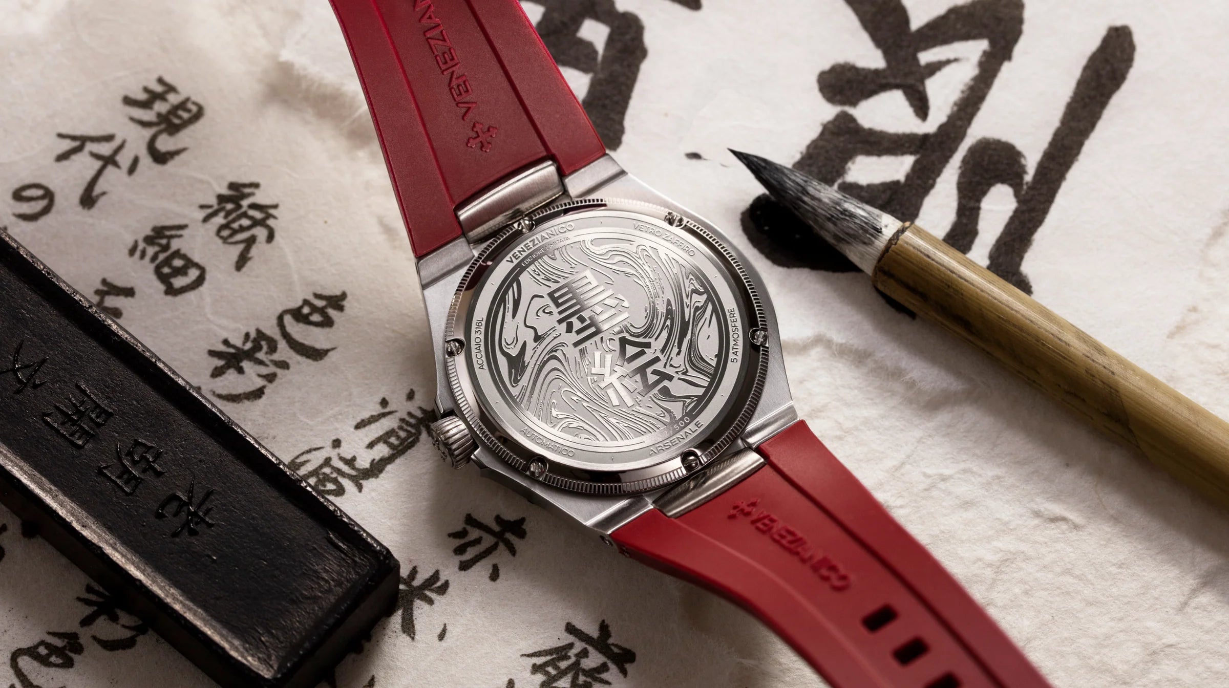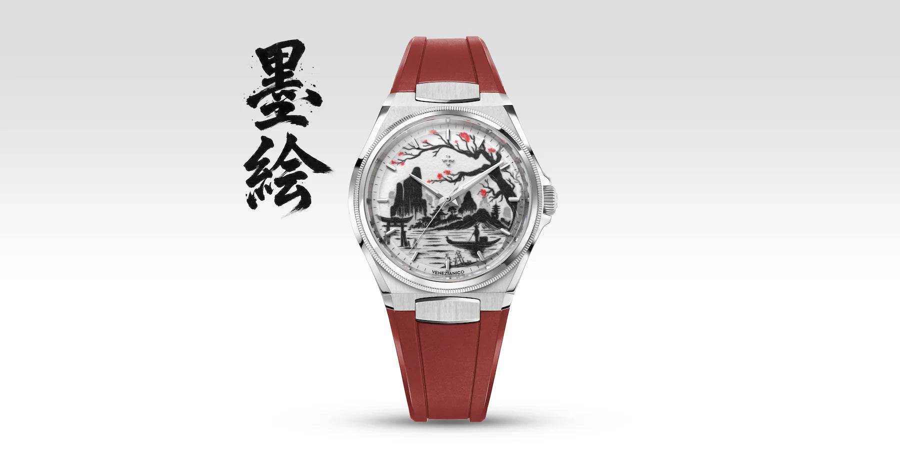 Arsenale Sumi-e nasce dallo stesso spirito esplorativo che per secoli ha guidato Venezia lungo la Via della Seta. Come allora le spezie, le sete e le idee viaggiavano da Oriente a Occidente, oggi questa creazione intreccia due mondi uniti dalla cura artigianale e dalla ricerca dell’armonia. Il quadrante, realizzato su autentica carta Washi, è ottenuto attraverso un processo tampografico in cinque fasi che riproduce la delicatezza dell’inchiostro e le sue sfumature sulla carta, dando vita a un paesaggio poetico racchiuso nel tempo.