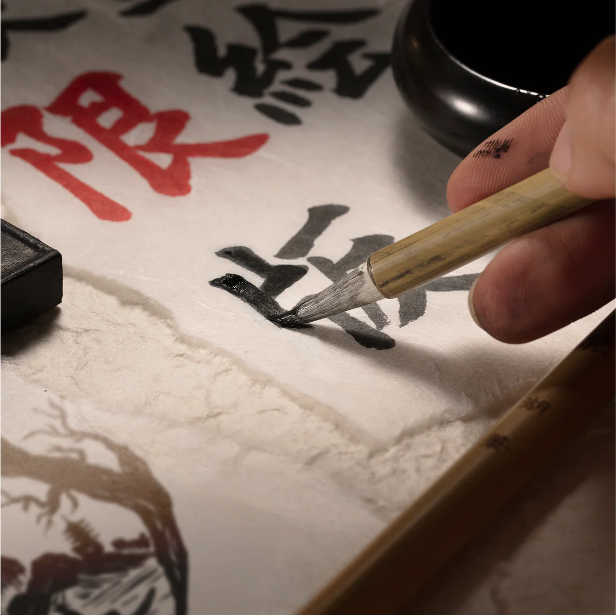 La tecnica si fonda sull’uso dell’inchiostro nero (sumi) steso con pennelli di diverse dimensioni su carta washi, un supporto tradizionale giapponese noto per la sua resistenza e per le venature naturali. Variando pressione e quantità d’acqua, l’artista ottiene gradazioni di tono che creano contrasti tra pieni e vuoti, conferendo profondità e movimento alla composizione. Ogni tratto è definitivo e non ammette correzioni: la forza del Sumi-e risiede proprio in questa essenzialità, che richiede padronanza tecnica e sensibilità artistica al tempo stesso.