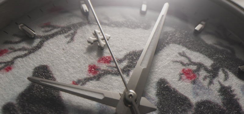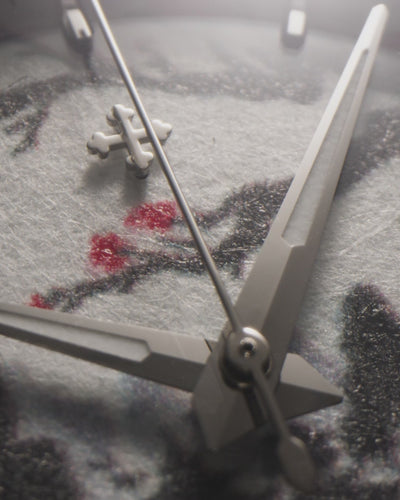 Per accompagnare l’orologio è stato realizzato un cofanetto che riprende il linguaggio visivo del quadrante, estendendo l’estetica del progetto oltre l’oggetto stesso. La superficie è decorata con una raffigurazione ispirata al disegno originale, riprodotta in alta definizione per preservare le sfumature e i contrasti tipici della tecnica Sumi-e. Sul lato inferiore una breve iscrizione, in inglese e giapponese, racconta l’origine dell’idea e il dialogo tra arte, cultura e tecnica che ne ha guidato lo sviluppo.