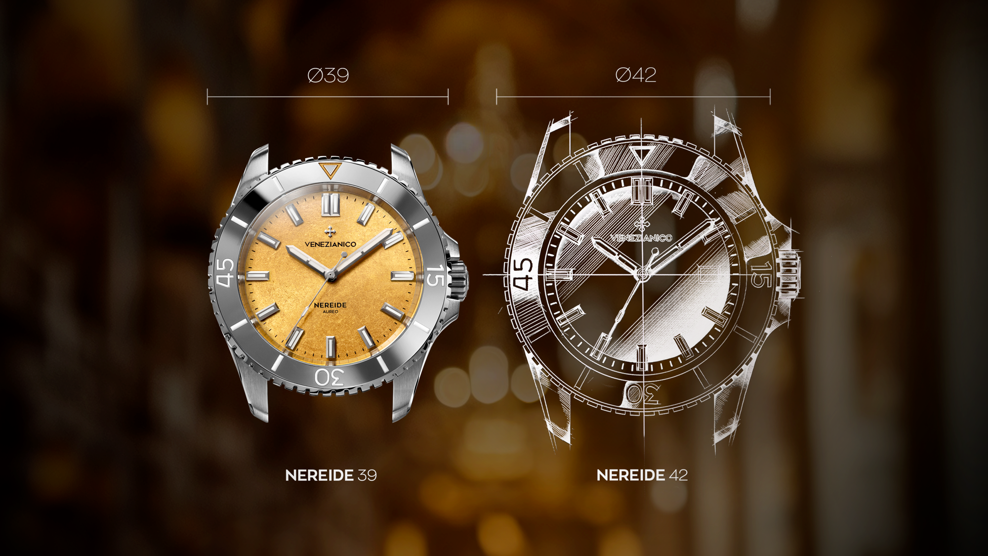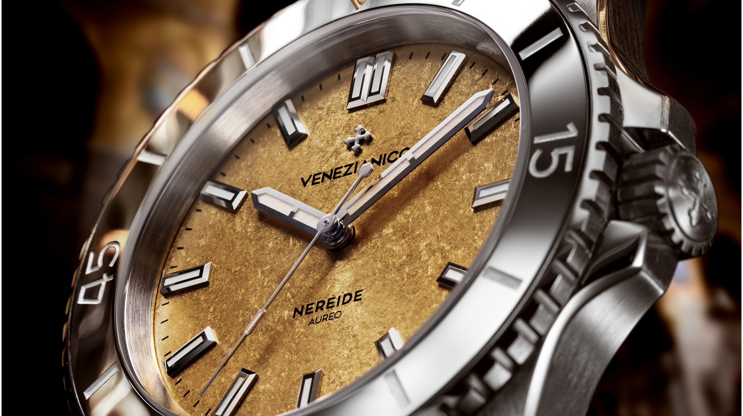 Il Nereide Aureo è un orologio subacqueo che fonde eleganza e innovazione. Il suo quadrante, ornato da un trattamento in oro puro 24k con finitura increspata, evoca l'antica arte veneziana della laminazione. La robusta cassa in acciaio 316L, unita a una lunetta in tungsteno, si integra perfettamente con il nuovo bracciale Sansovino, caratterizzato da maglie lucide e satinate e una chiusura con micro-regolazione che garantisce solidità e massimo comfort al polso.