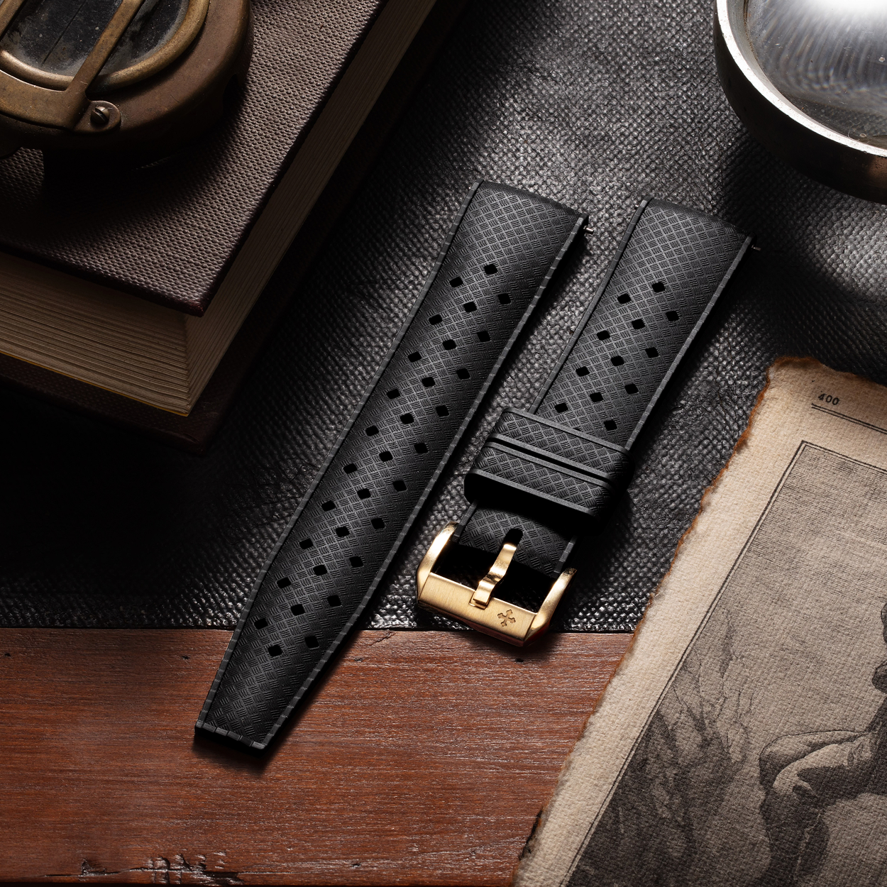 Il cinturino Tropic, nato negli anni '60 e '70 per orologi subacquei sottili, ha conquistato gli appassionati di immersioni con leggerezza, flessibilità e il caratteristico motivo a intreccio con fori traspiranti. Reinterpretato per il Nereide, è realizzato in gomma galvanizzata FKM, unendo il fascino di un classico senza tempo ad un materiale che garantisce durata e affidabilità.