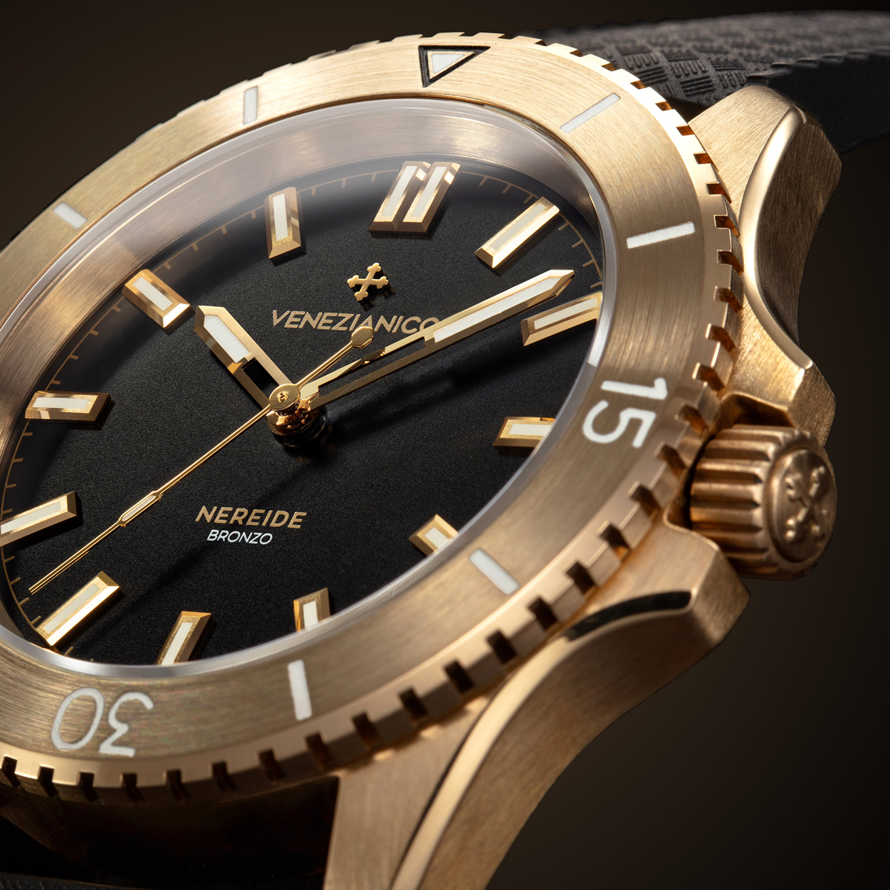 Il Nereide Bronzo 39 celebra il legame tra Venezia e il bronzo, metallo un tempo utilizzato per i caschi dei palombari lagunari grazie alla sua resistenza alla corrosione e al fascino della patina. Il nuovo diametro da 39 mm conserva l’identità robusta della collezione, ma con proporzioni più versatili. Ogni esemplare evolve nel tempo, trasformandosi in un pezzo unico che racconta la storia di chi lo indossa.