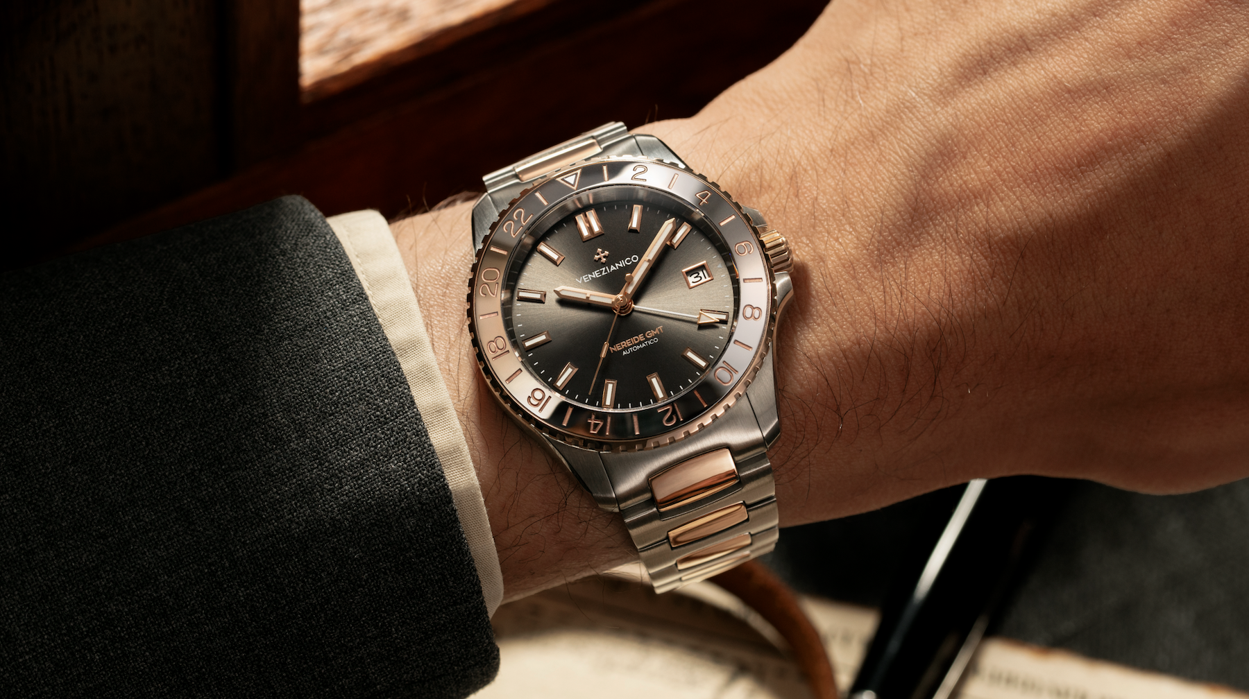 Indossare il Nereide GMT Grand Tour significa portare al polso lo spirito del viaggio come forma di conoscenza. Le proporzioni compatte e il peso bilanciato garantiscono comfort in ogni occasione, dai lunghi spostamenti alla quotidianità. Il contrasto tra acciaio e oro rosa 5N dona al segnatempo un’eleganza sobria e versatile, mentre la funzione True GMT consente di leggere due fusi orari con immediatezza, garantendo continuità e precisione in ogni spostamento.