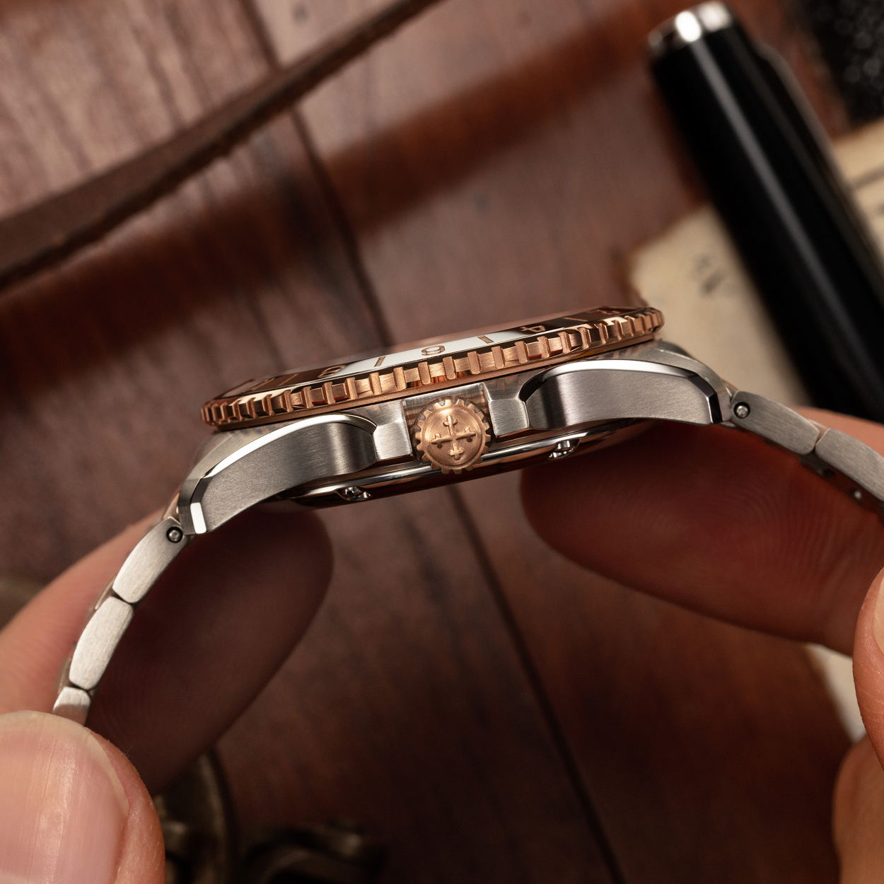 La cassa da 39mm unisce acciaio e trattamento IP oro rosa 5N in un equilibrio di proporzioni e luminosità, mentre la lunetta in tungsteno ne definisce il profilo con eleganza. Il quadrante con finitura Soleil riflette la luce in modo radiale, rivelando sfumature diverse a ogni movimento. Al suo interno, il calibro automatico Miyota 9075 con funzione True GMT consente di regolare l’ora locale in modo indipendente, accompagnando chi viaggia con precisione impeccabile.