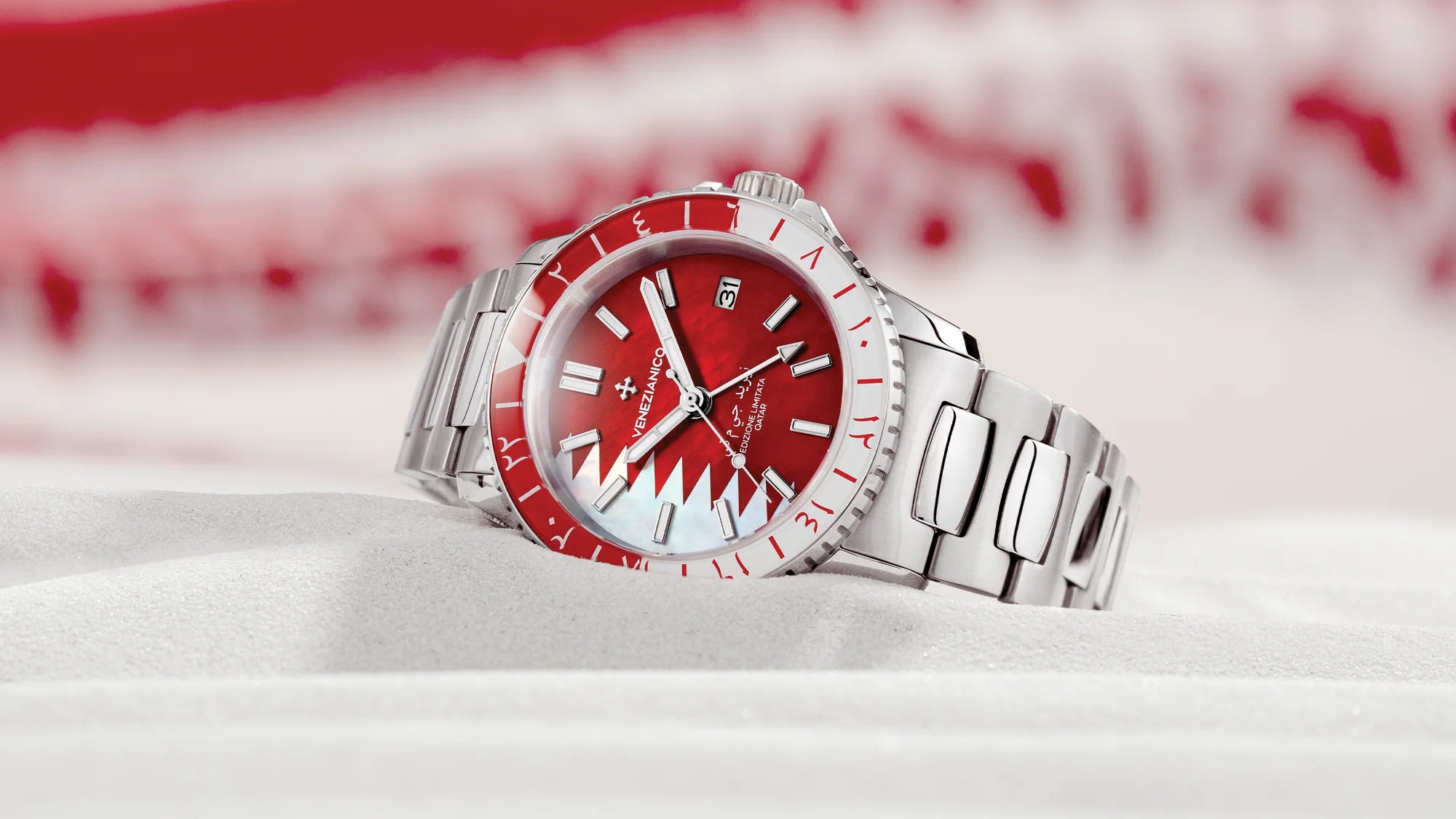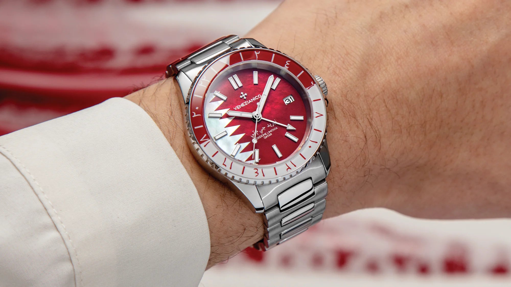 I riflessi magici della madreperla mosaicata esaltano la profondità e il contrasto tra i due colori, il bianco ed il rosso, della bandiera del Qatar. Una dualità che si ripete nella lunetta, in vetro BK7 antigraffio, scandita dagli indici in cifre arabe, a rimarcare l’origine dell’ispirazione di questo segnatempo.