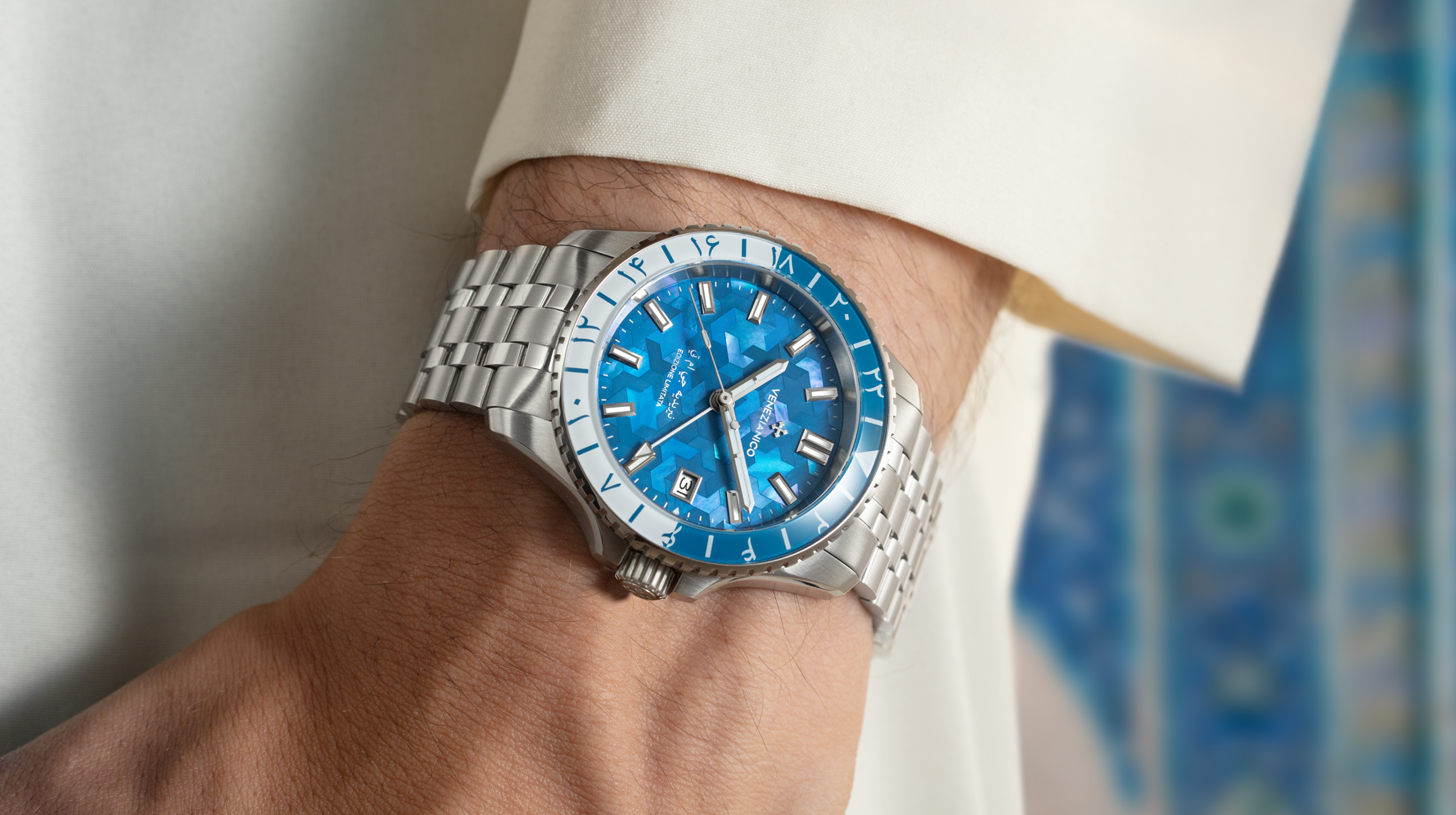 Nel cuore di questo quadrante in madreperla a mosaico prende forma un omaggio alla grande arte timuride. Le sfumature blu cobalto si intrecciano in motivi geometrici ispirati ai rivestimenti architettonici di Samarcanda, crocevia culturale della Via della Seta. I numeri in carattere persiano (farsi) sulla lunetta completano una composizione che unisce artigianalità e memoria storica. Un’edizione limitata che racchiude secoli di dialogo tra Venezia e l’Asia Centrale.