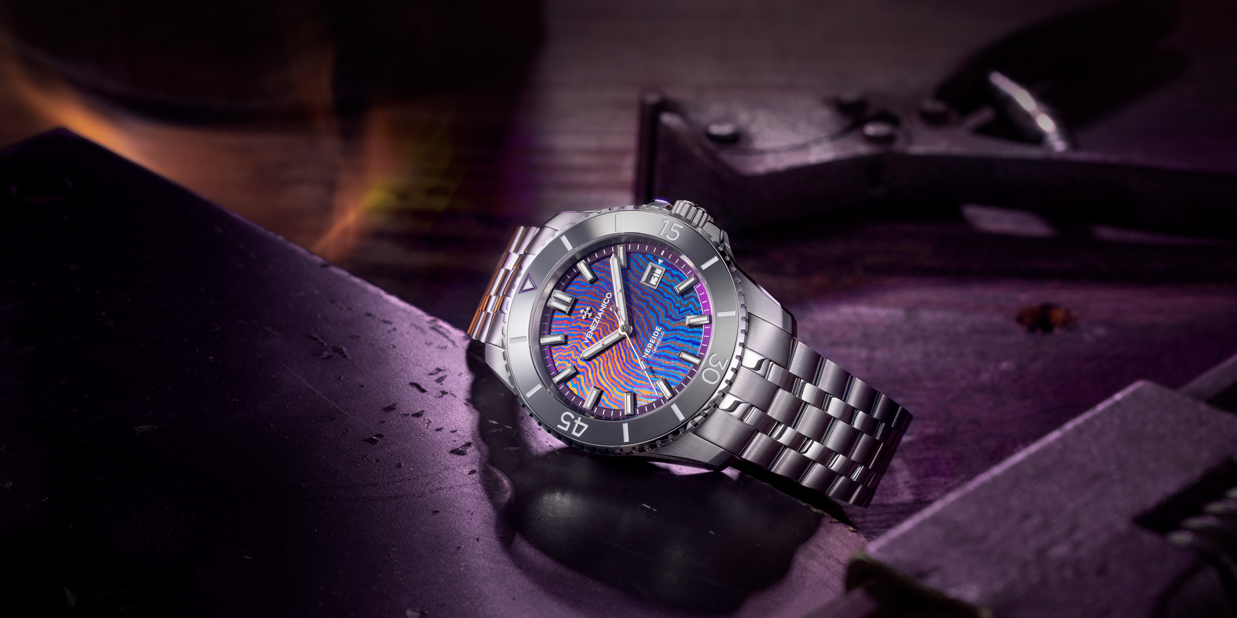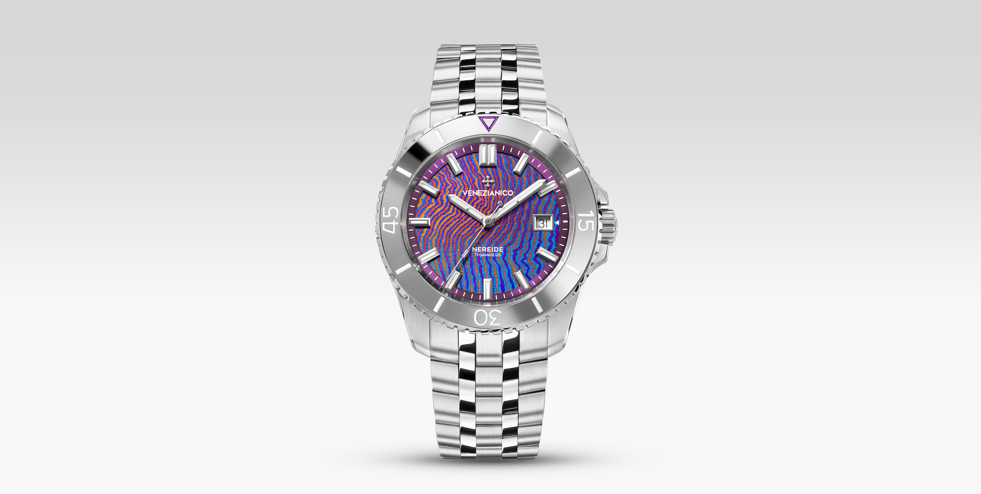 Nereide Ti-Damascus nasce dall’incontro tra l’arte della damascatura e la sperimentazione sui materiali. Il quadrante è realizzato in una combinazione di diverse leghe di titanio fuse e piegate con una tecnica ispirata alle lavorazioni storiche del metallo, poi sottoposte a trattamento termico per rivelare trame e venature uniche, impossibili da replicare. La cassa in acciaio 316L è abbinata a una lunetta in tungsteno lucido, scelta per garantire resistenza e continuità estetica. Il calibro Sellita SW200-1 è arricchito da una massa oscillante scheletrata, realizzata internamente con Côtes de Genève radiale e trattamento IP viola.