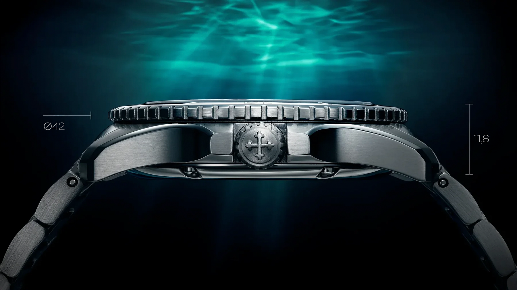 Il sommergibile Nereide, da cui trae ispirazione tutta la collezione, è raffigurato in navigazione sommersa nell’incisione al centro del fondello, per ricordare come questo orologio non rinunci alle prestazioni subacquee, conservando la capacità di immergersi fino a 200m di profondità e la lunetta girevole che permette di monitorare i tempi di immersione.