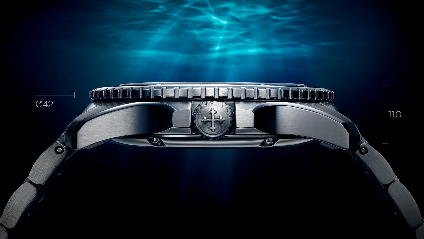 Il sommergibile Nereide, da cui trae ispirazione tutta la collezione, è raffigurato in navigazione sommersa nell’incisione al centro del fondello, per ricordare come questo orologio non rinunci alle prestazioni subacquee, conservando la capacità di immergersi fino a 200m di profondità e la lunetta girevole che permette di monitorare i tempi di immersione.