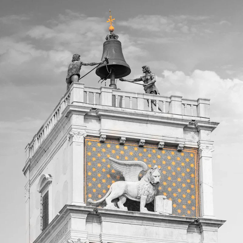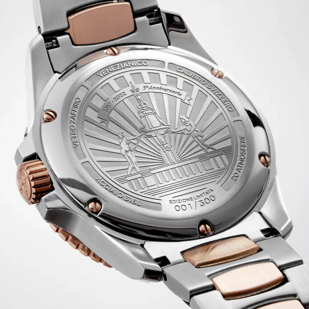 Il fondello finemente inciso richiama l'ispirazione del nostro logo, la croce posta sulla sommità della Torre dell'Orologio di piazza San Marco. Nella metà inferiore trova spazio il numero progressivo che identifica il singolo esemplare.