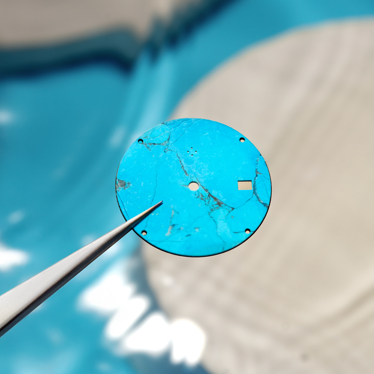 Il turchese richiede una lavorazione meticolosa e delicata, in linea con la sua natura fragile. Il taglio a freddo consente di sagomarlo senza alterarne l’integrità, ricavando sottili lastre ideali per la realizzazione di quadranti. Seguono fasi di rifinitura e lucidatura con abrasivi a grana fine, che donano al materiale una superficie compatta e luminosa, esaltandone la naturale espressività.