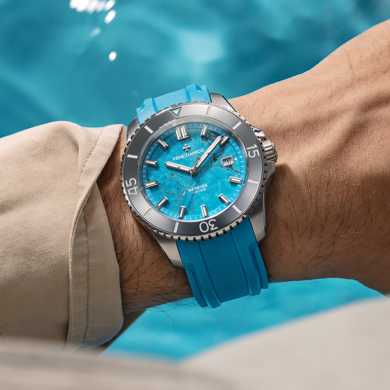 Il quadrante in turchese naturale riflette la luce con sfumature uniche, richiamando i colori più brillanti della laguna veneziana. Le sue venature irregolari ricordano la pietra immersa nell’acqua, rendendo ogni orologio unico. Il cinturino azzurro riprende questi toni e rafforza il legame con il mare, creando un segnatempo che racconta l’essenza autentica di Venezia: Vibrante, luminosa, in costante trasformazione.