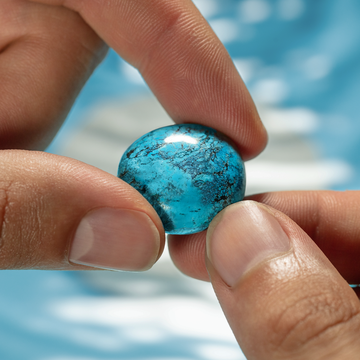 Il turchese è una gemma opaca dai toni che spaziano dall’azzurro cielo al verde acqua. Apprezzato fin dall’antichità per la sua bellezza naturale e il valore simbolico, è composto principalmente da rame e alluminio. La sua superficie porosa, attraversata da venature irregolari, rende ogni esemplare unico. Ricco di storia, il turchese è da sempre associato all’equilibrio, alla lucidità mentale e al legame profondo con gli elementi della natura.