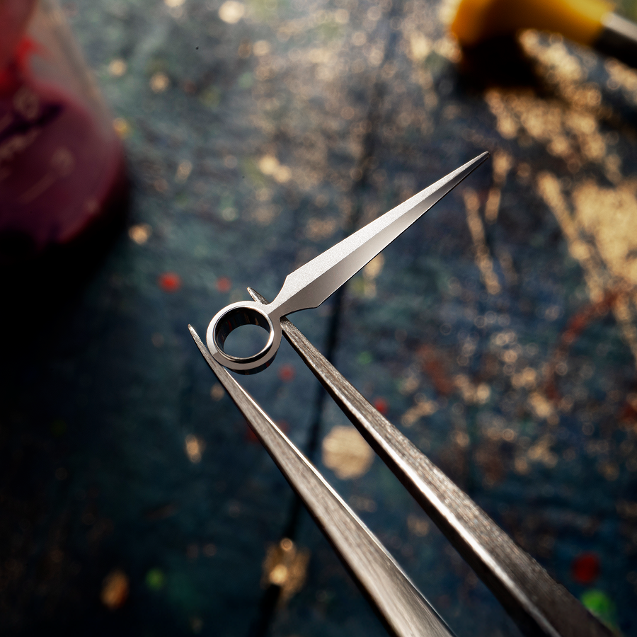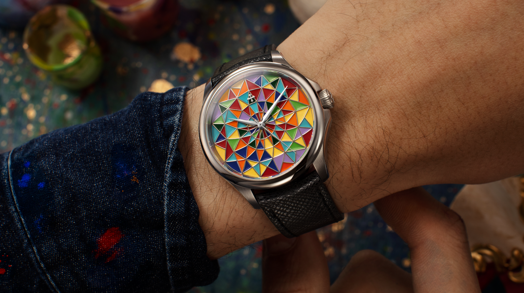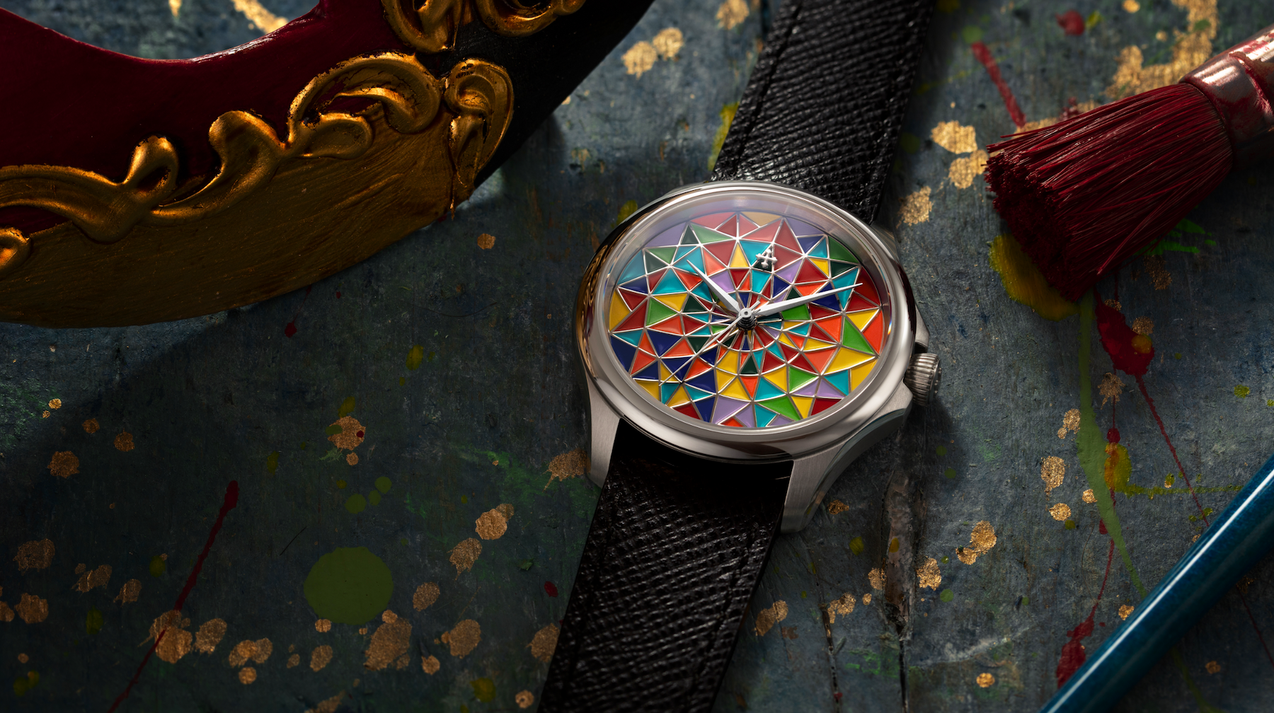 La costruzione del quadrante parte da una base incisa con una geometria tridimensionale precisa, pensata per accogliere il colore come una vera opera artistica. Ogni singola cella viene poi riempita manualmente con smalto a freddo, utilizzando strumenti di precisione e dosando il colore con estrema cura, studiando l’accostamento delle tonalità per creare un equilibrio ideale.