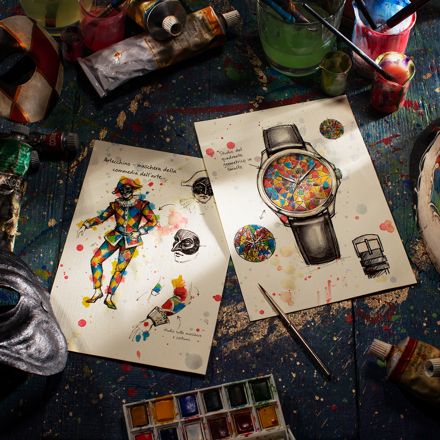 Redentore Arlecchino nasce sulla carta, tra studi di colore e bozzetti ispirati al costume della maschera più celebre del Carnevale veneziano. Le iconiche toppe geometriche diventano i settori del quadrante, organizzate in una struttura precisa che alterna superfici smaltate, bordi netti e celle colorate, creando una composizione ordinata e dinamica.