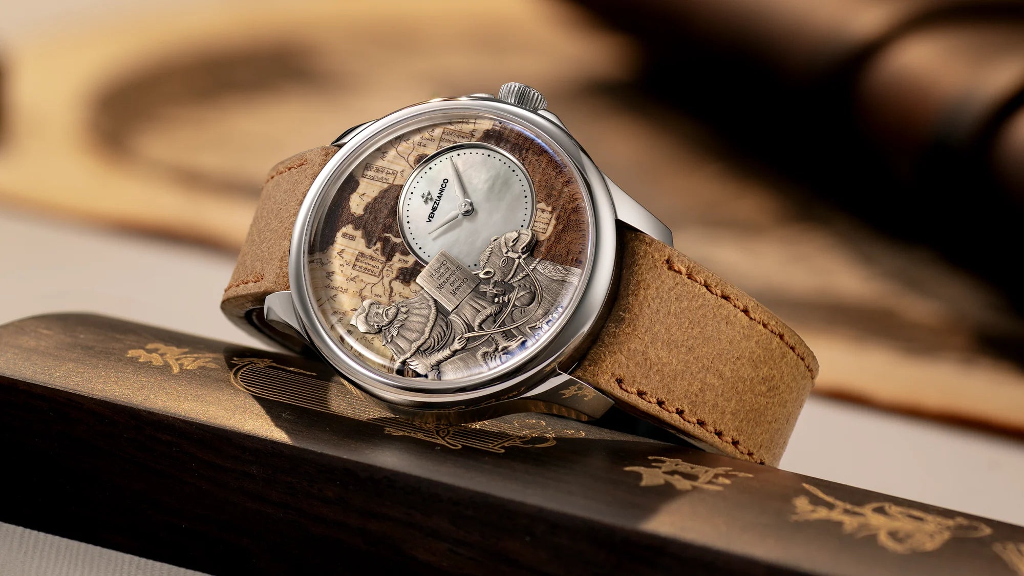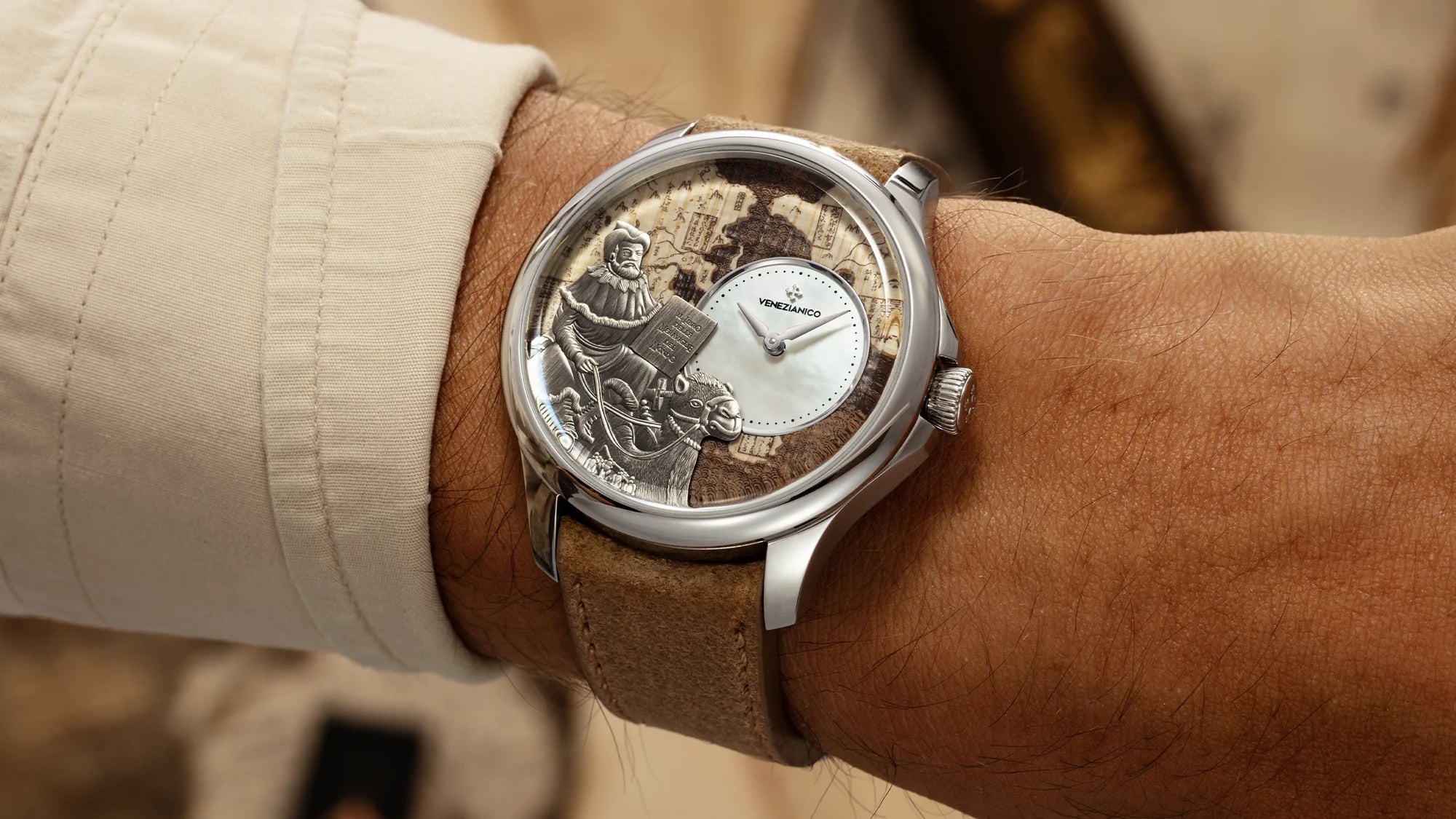 Il quadrante dell'orologio celebra il leggendario Marco Polo nel 700° anniversario della sua morte. Questa Edizione Limitata cattura l'essenza delle sue avventure con un bassorilievo in ottone che lo raffigura su un dromedario, con "Il Milione" in mano. Lo sfondo in papiro presenta una mappa cinese dell'Asia, evocando i suoi viaggi epici verso l'Oriente. Un piccolo quadrante in madreperla, decentrato a ore 3, arricchisce la composizione con un tocco di eleganza, omaggiando la figura del celebre esploratore.